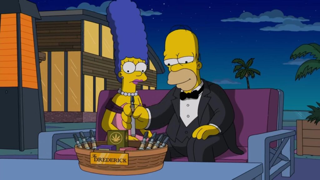 • The dispensary is portrayed as bright, clean, and trendy – selling THC-infused teas, edibles, vape pens, etc., to well-heeled clientele. Marge, initially uncomfortable, learns to use terms like “cannabis” instead of “weed” and treats it like selling any wellness product. The portrayal here is neutral-to-positive: it normalizes marijuana as a legitimate business. There are comedic bits about clueless customers (“Is this one of those mary-jee-wanna cigarettes?” asks Mr. Burns) and about marketing talk. Marge’s wholesome approach ironically makes her a star salesperson of pot.