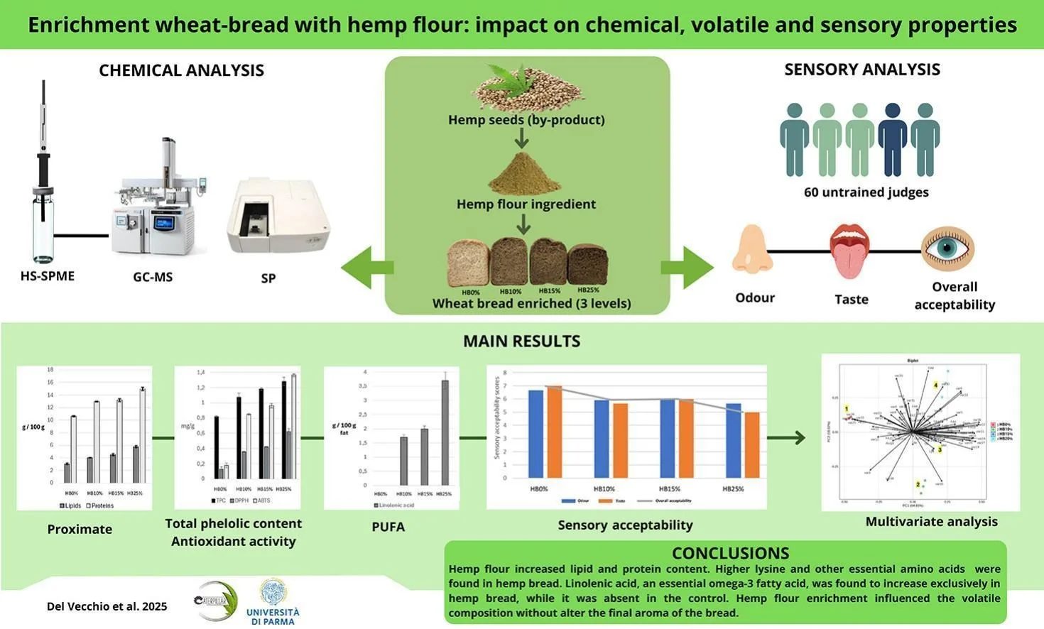 Fatty-acid profiling confirmed that hemp additions introduced linolenic acid absent from wheat bread, while amino-acid analysis showed consistent enrichment of essential amino acids at each substitution level. Antioxidant testing with Folin, DPPH and ABTS assays showed a dose-response, with 25% hemp flour yielding the strongest readings. A principal-components analysis separated the breads cleanly by inclusion rate, driven by rises in antioxidants, key amino acids and terpene-linked volatiles in the hemp groups.