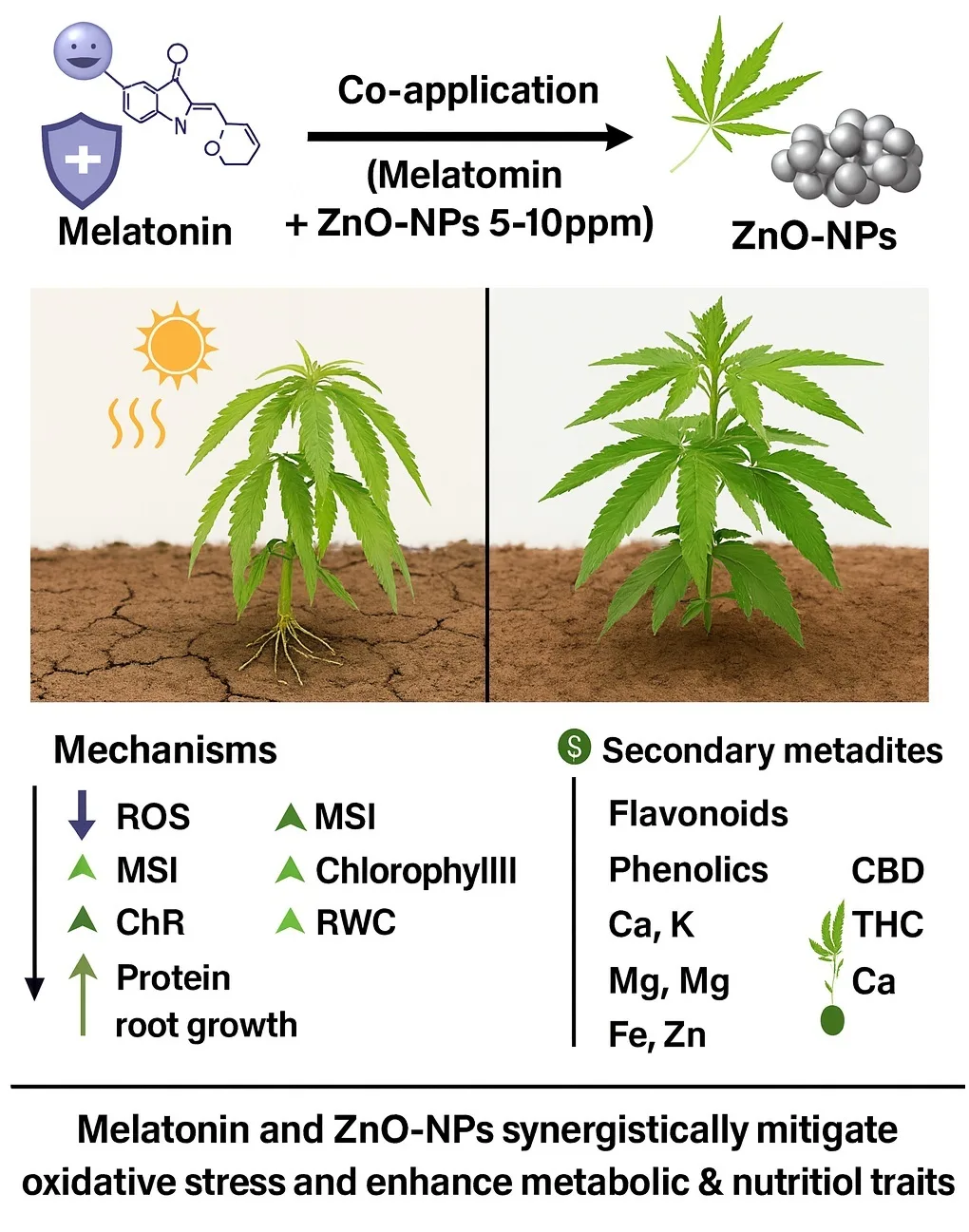 The study, published in the journal Plant Nano Biology, is titled Synergistic Effects of Melatonin and Zinc Oxide Nanoparticles on Oxidative Stress Mitigation, Nutrient Accumulation, and Secondary Metabolite Enhancement in Cannabis sativa L.